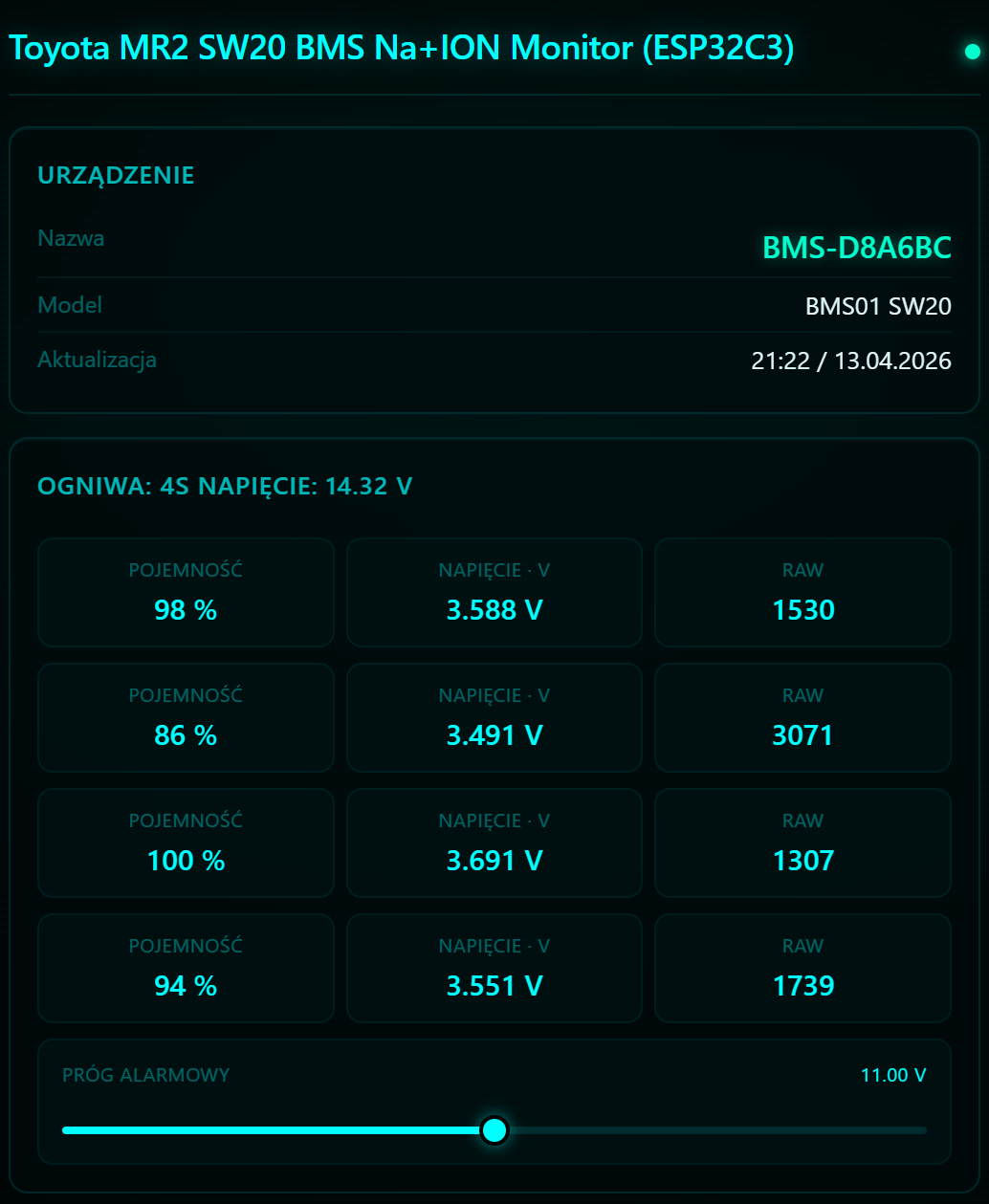 I wrote a lightweight web application that connects to the pack and displays real-time status: individual cell voltages, state of charge, current draw, temperature, and event logs. The interface is accessible from any device on the local network and requires no external dependencies.